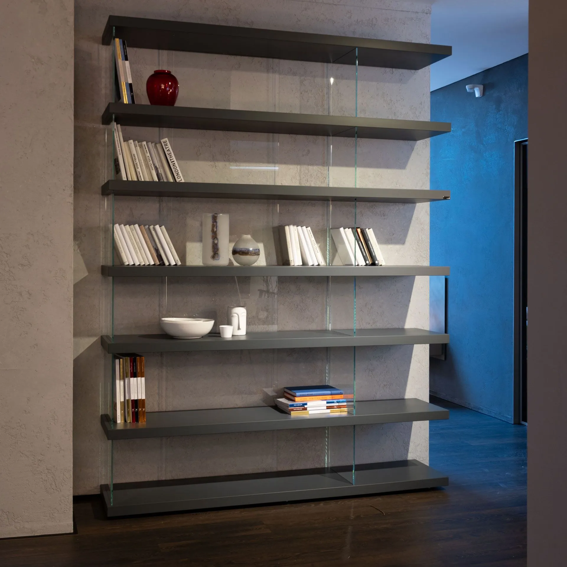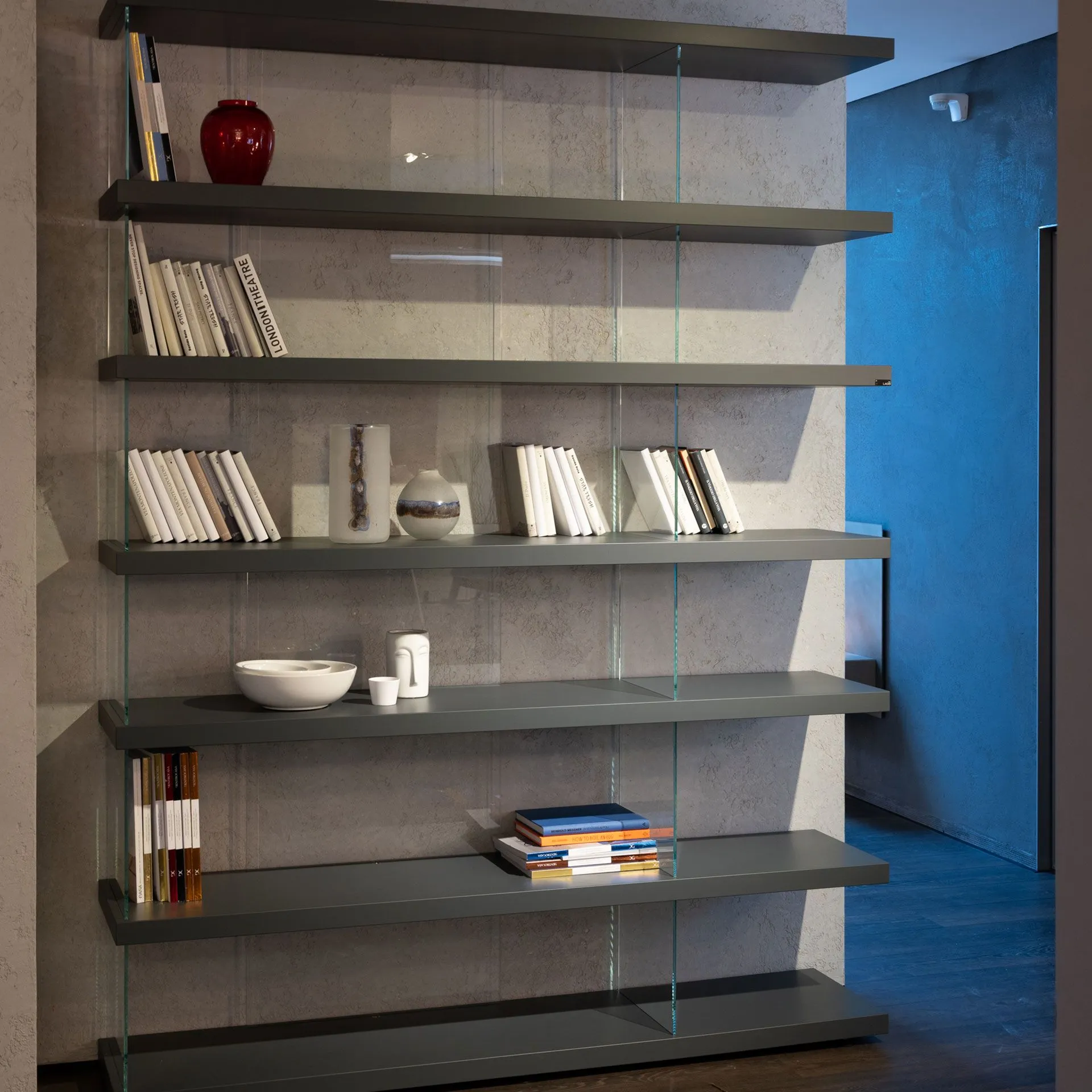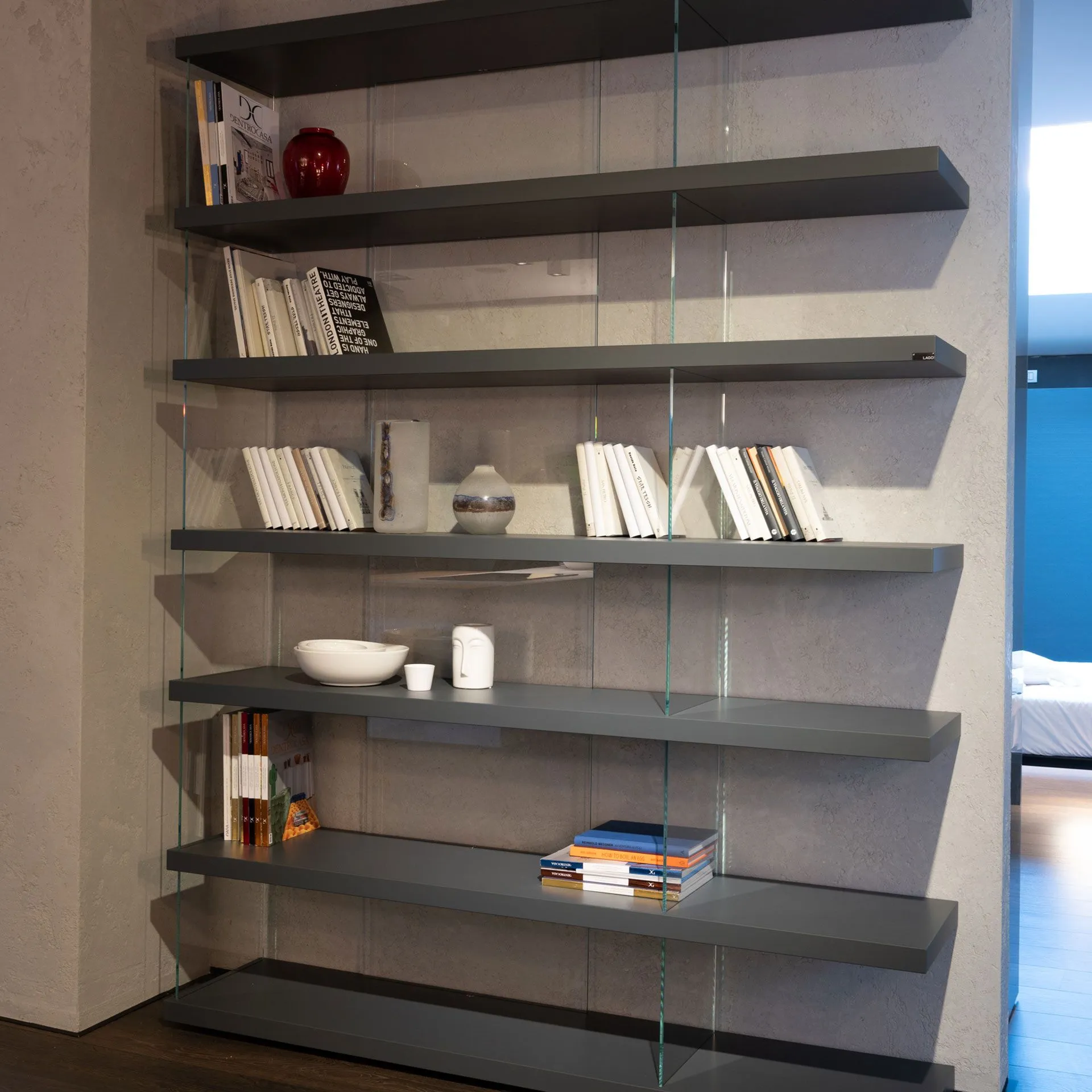 Air model free-standing bookcase in the dimensions L,184xH.243,7cm including 07 shelves in the graphite lacquered finish, with extra-clear glossy glass finish set.