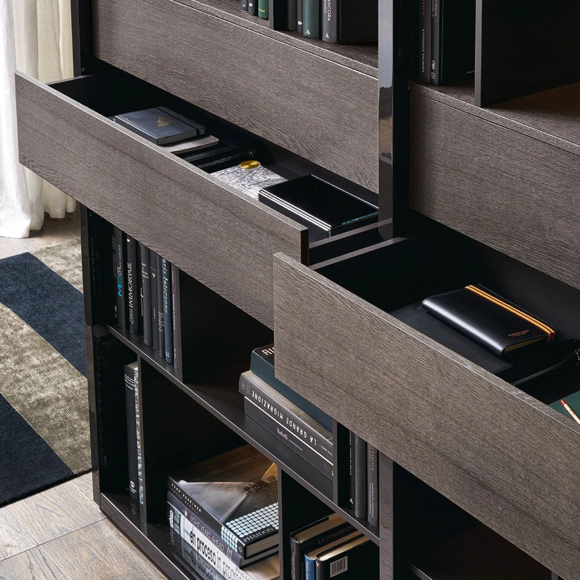 With this type of wooden bookcases you will be able to choose colors and textures that più they satisfy you. Poliform is able to provide modern style bookcases that are able to solve the needsà of life but also to fulfill personal tastes. The Poliform bookcase system presents versatile compositional solutions, which house objects, divide the space and represent a precious element of decoration. The Poliform wooden bookcase best organizes metropolitan living spaces as well asé più classics. Poliform designs a wide range of bookcases for living rooms, mixing technical and aesthetic innovation.