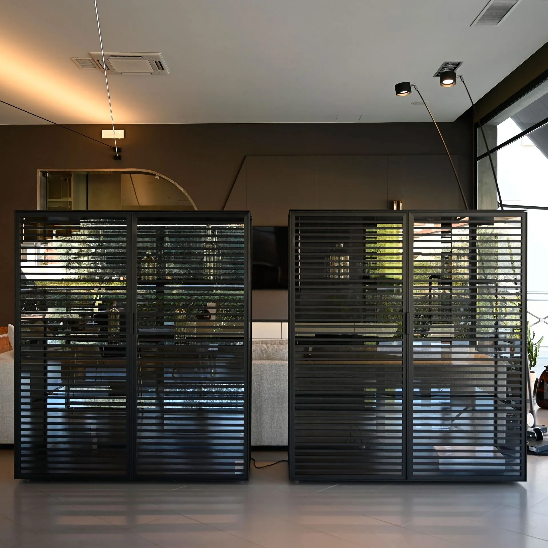 Pair of showcases L.130,7xH.151xP.51,5cm composed of n.02 glass doors in 63 Gray glass finish and structure in 13 Black finish. With internal glass shelves and Led lighting.
