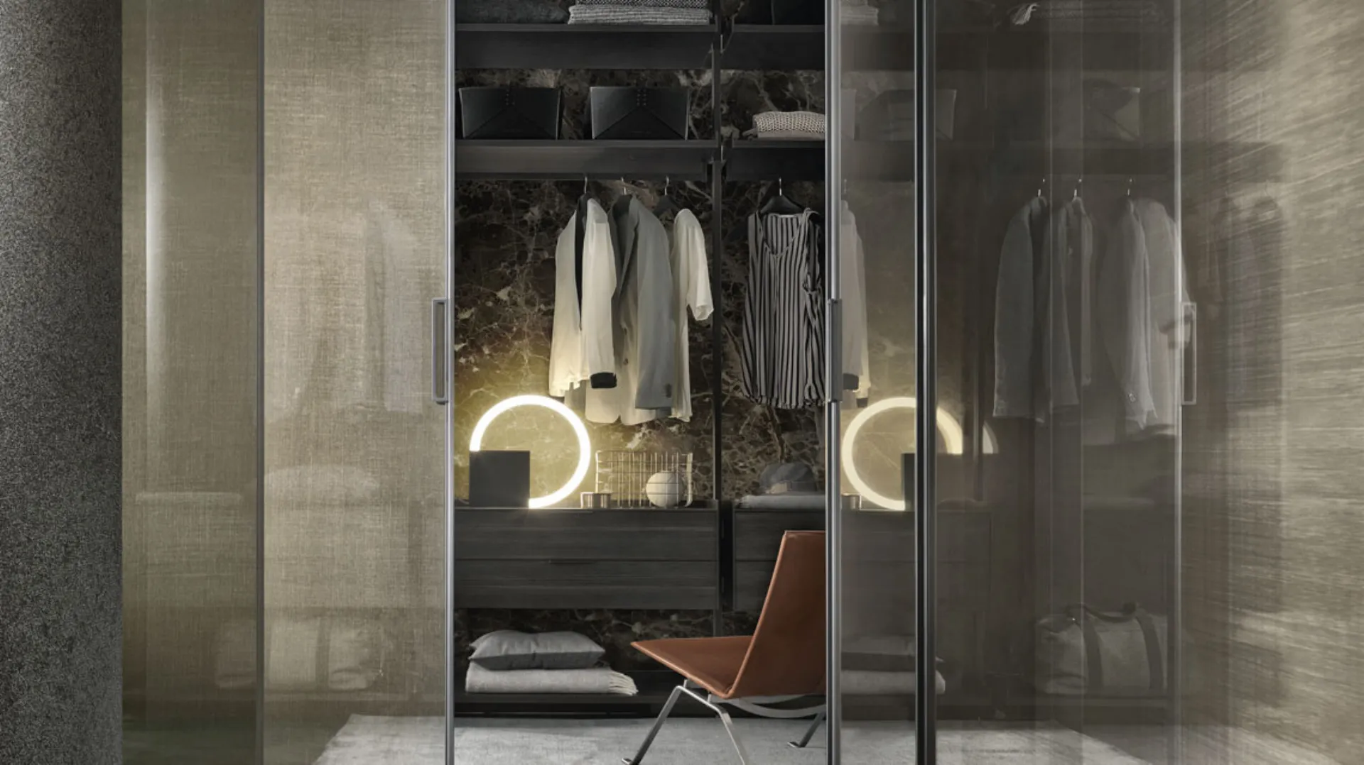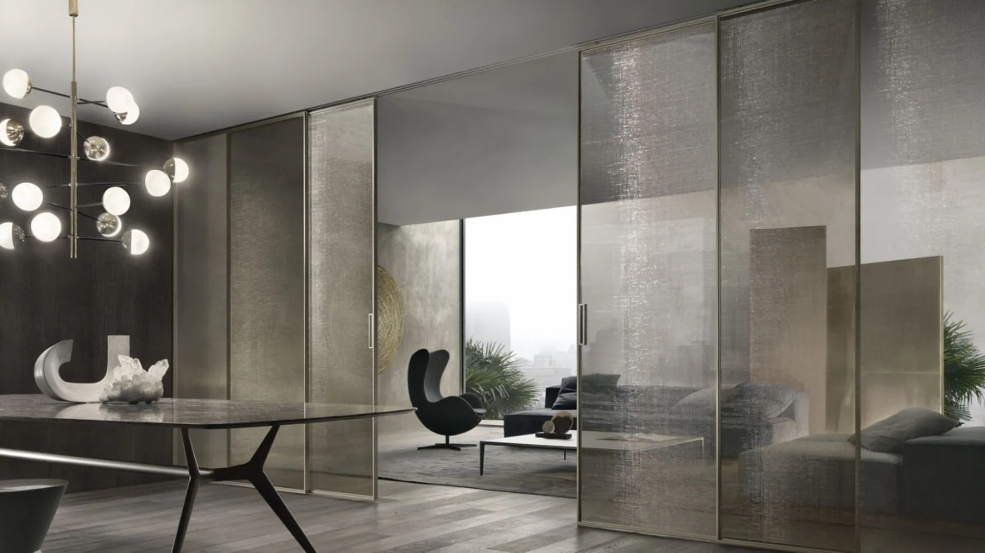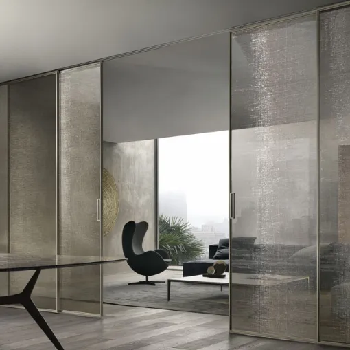 The Velaria Rimadesio sliding door is characterized by elegance and technology and finds its place in contemporary homes. Rimadesio with its internal sliding doors can demonstrate a deep attention to detail and the necessary openness towards trends. Rimadesio's lines of sliding doors are distinguished by the varietyà of possible alternatives in terms of finishes and aesthetic content. The Velaria Rimadesio sliding door integrates technology and aesthetics into a stylish door.