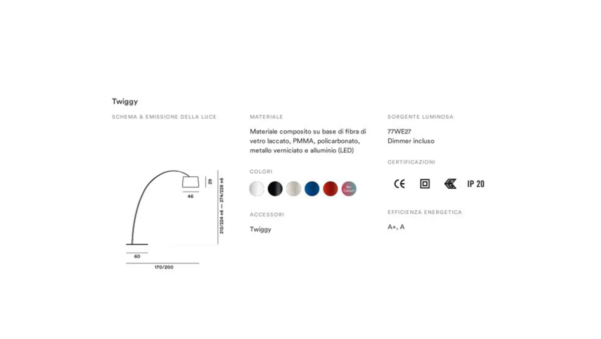 Material: Composite material based on lacquered fiberglass, PMMA, polycarbonate, painted metal and aluminum (LED)