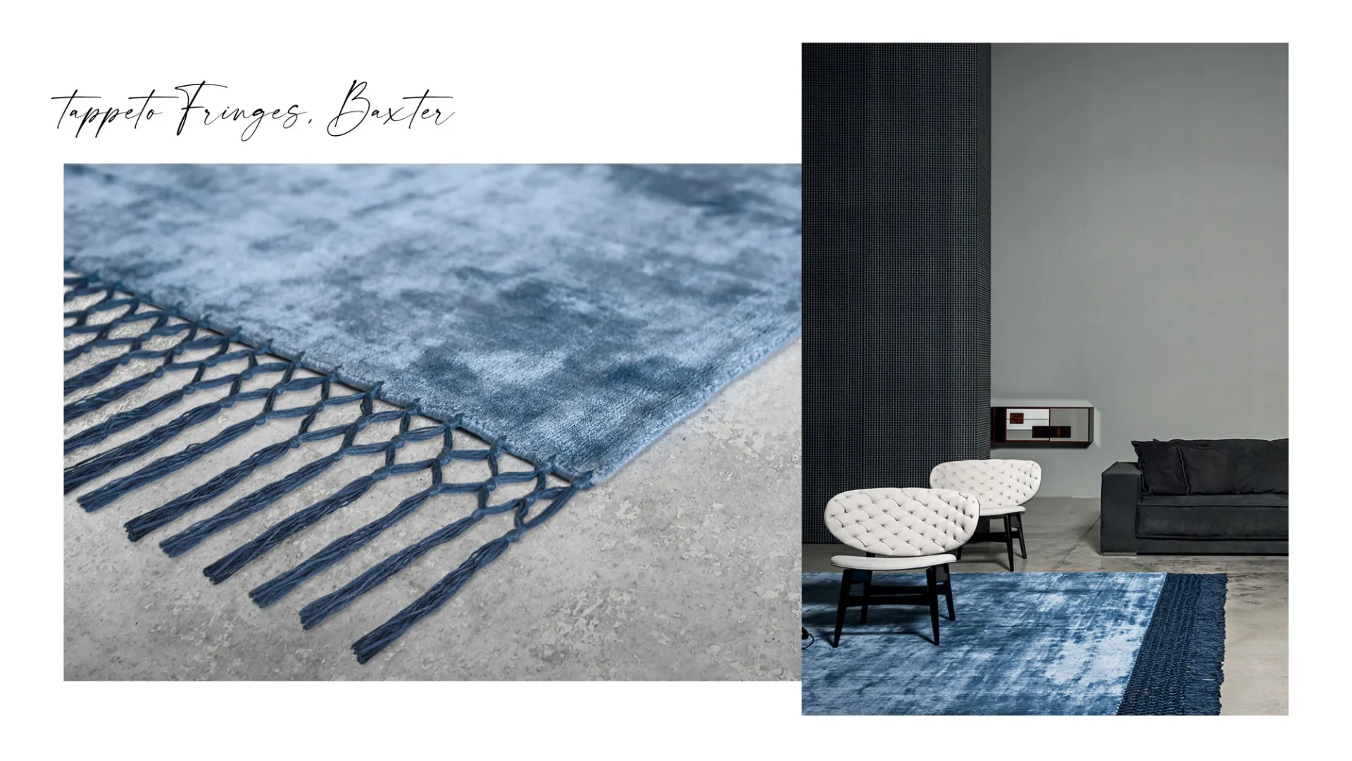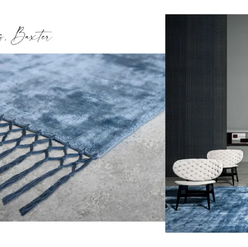 Complements such as carpets are an important part of home furnishings. The Fringes rug is one of the iconic products of the Baxter brand. A carpet handmade on wooden looms, composed of a mix of vegetable silks present in nature, including soy, banana and bamboo. We offer it in its Light Blue + Blue version.