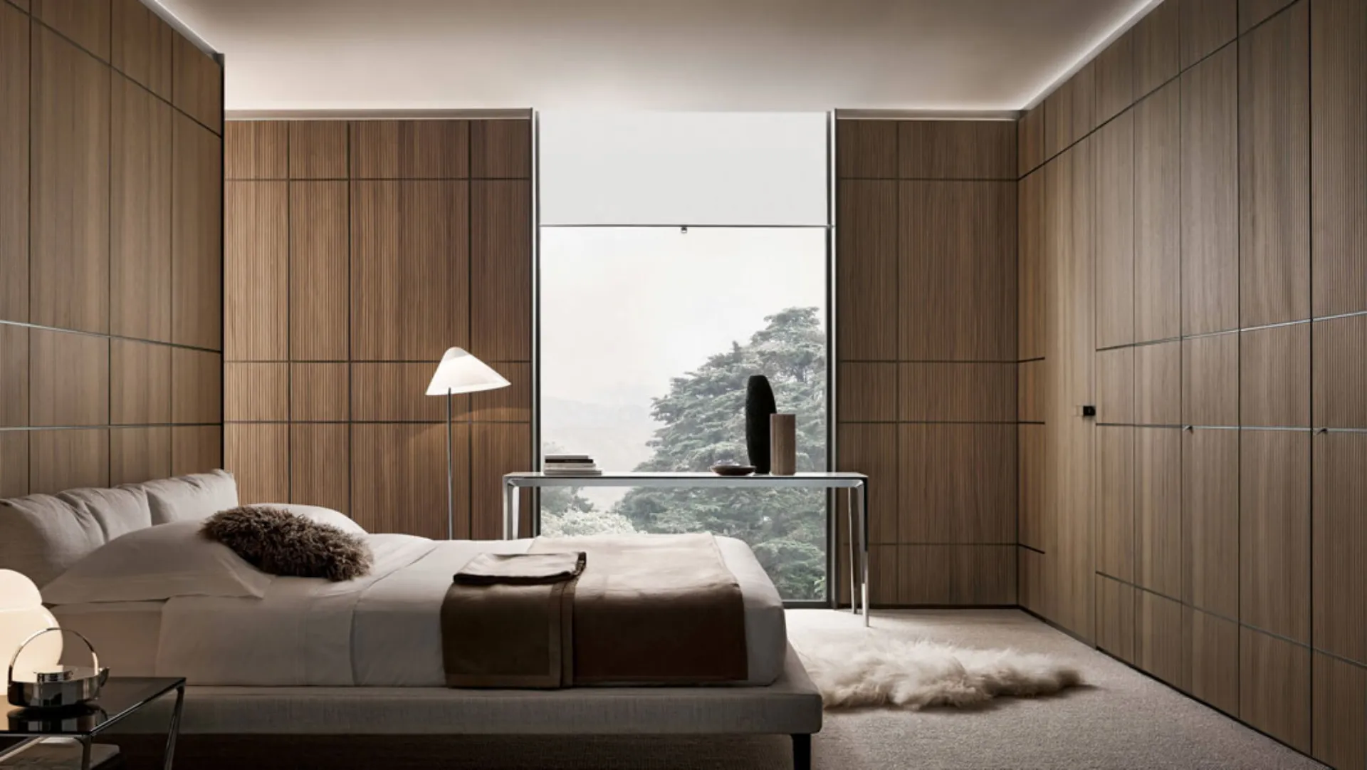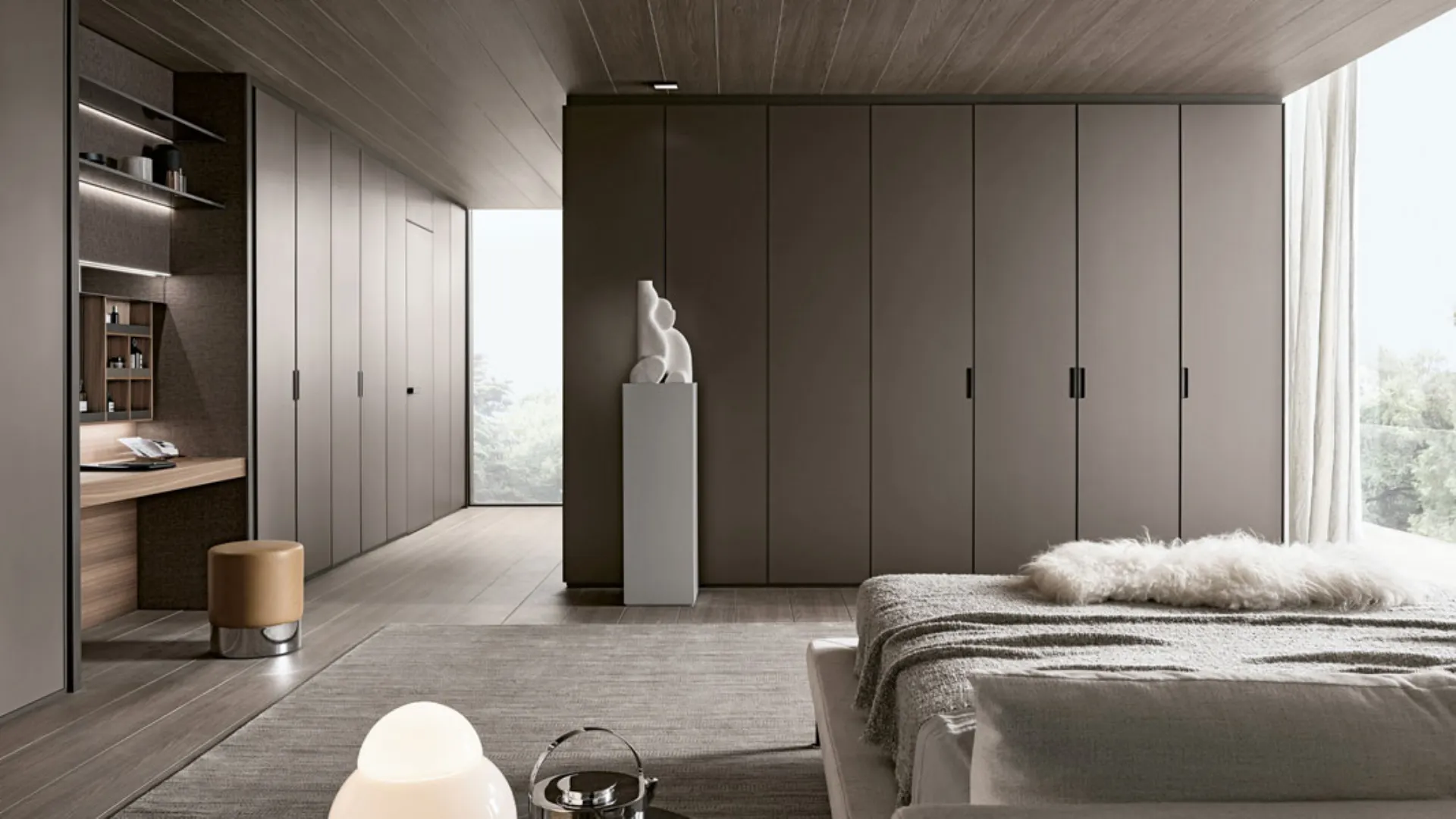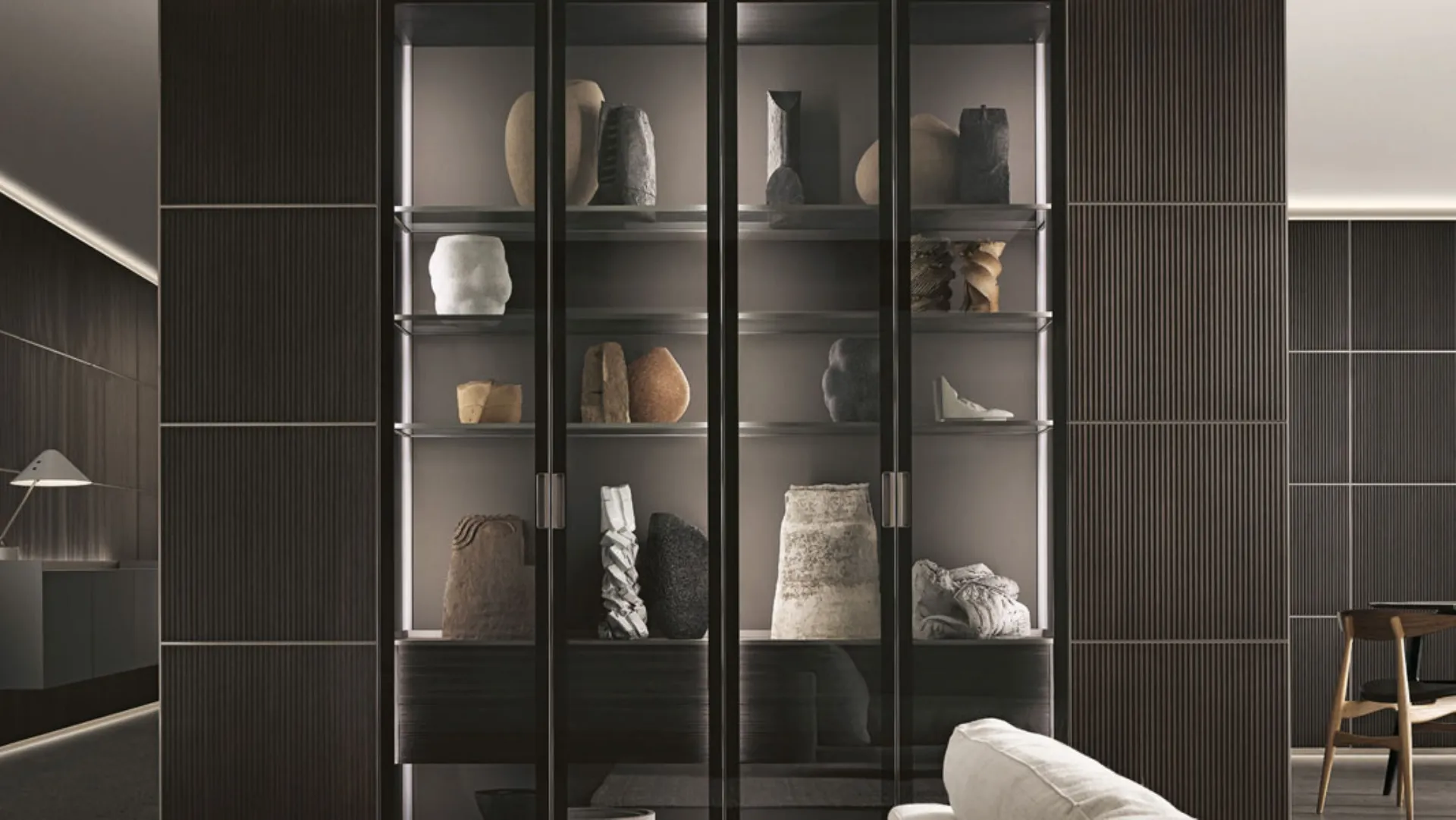 An important and at the same time sober and elegant scenographic presence, the system adapts perfectly to even the most complex spaces, transforming itself into a door or window opening, or revealing compartments equipped for storage.