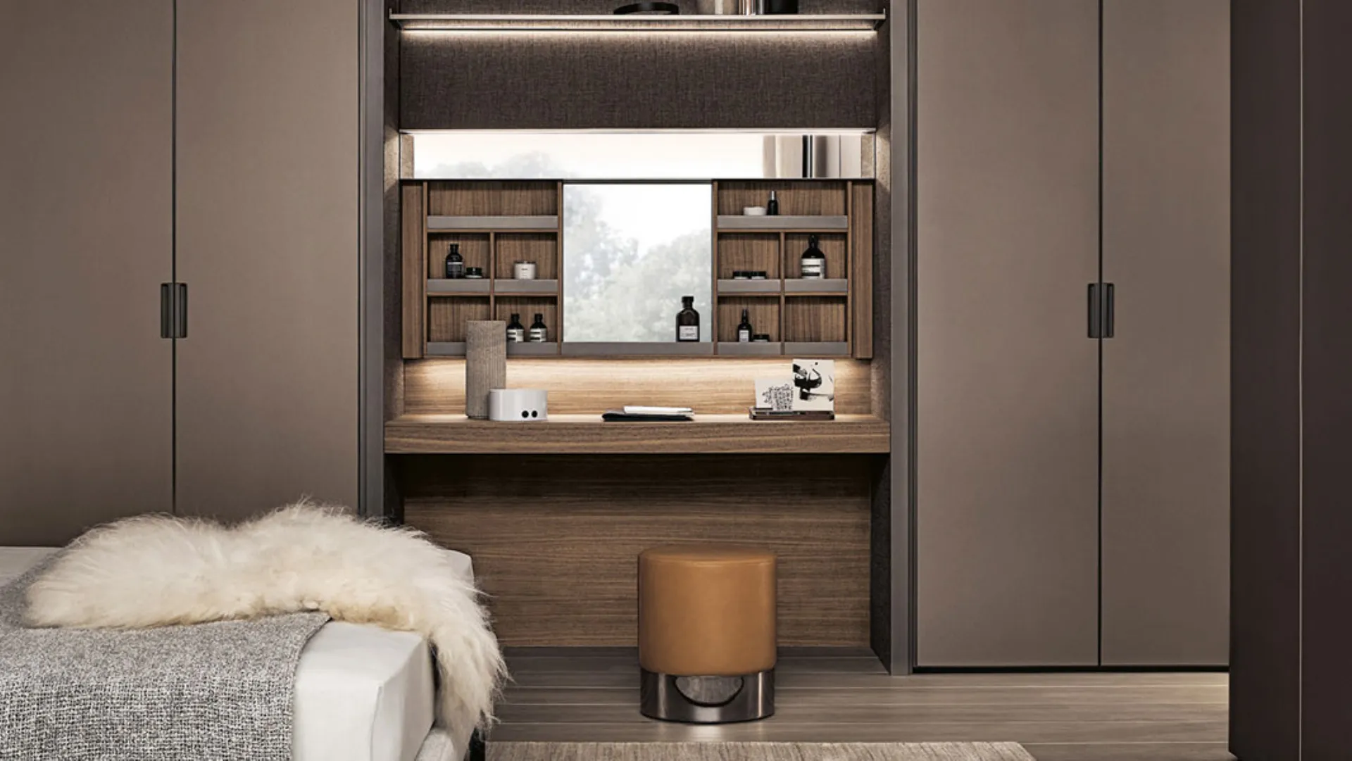 A corner dedicated to self-care, a space designed to integrate with the wardrobe systems of the Rimadesio collection (Modulor, Abacus, Cover, Cover Freestanding and Dress Bold).