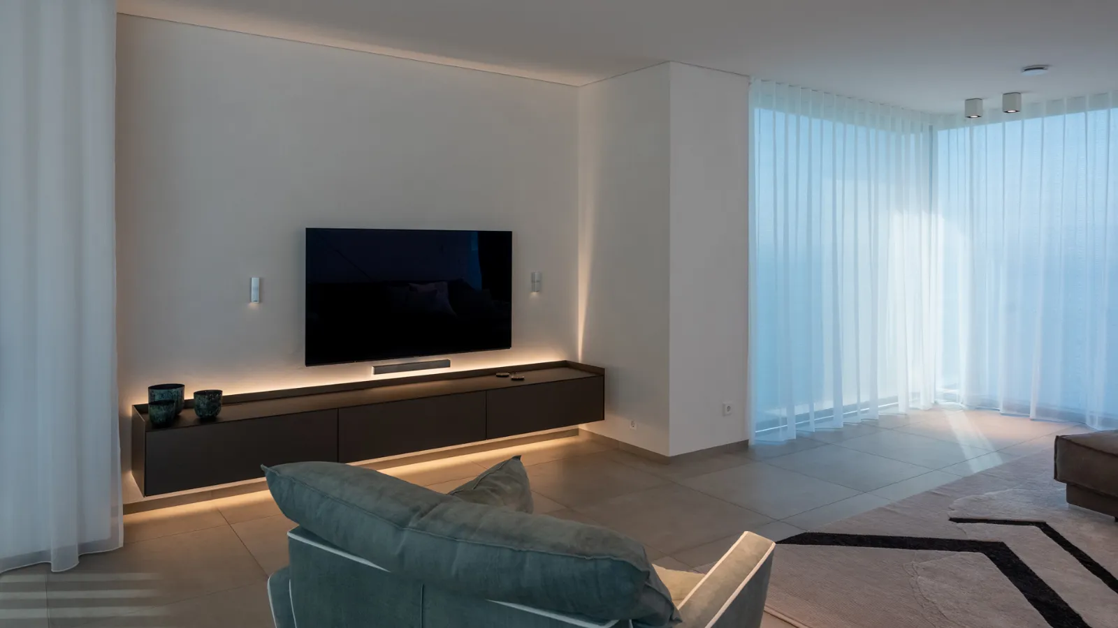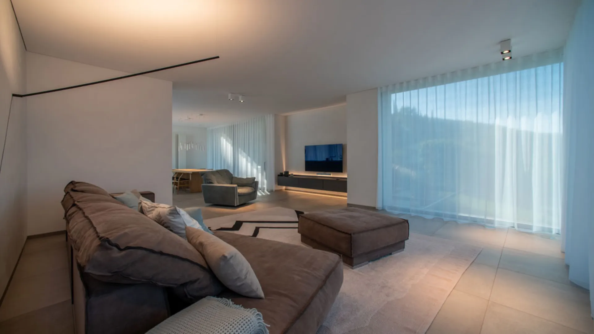 An entirely custom-designed space, with large windows that give brightness to the environment. The large windows act as frames of a space that captures moments of daily life. The living room elements make the space comfortable and stylish.