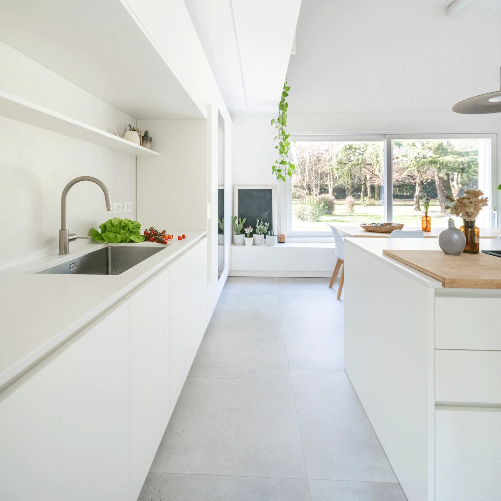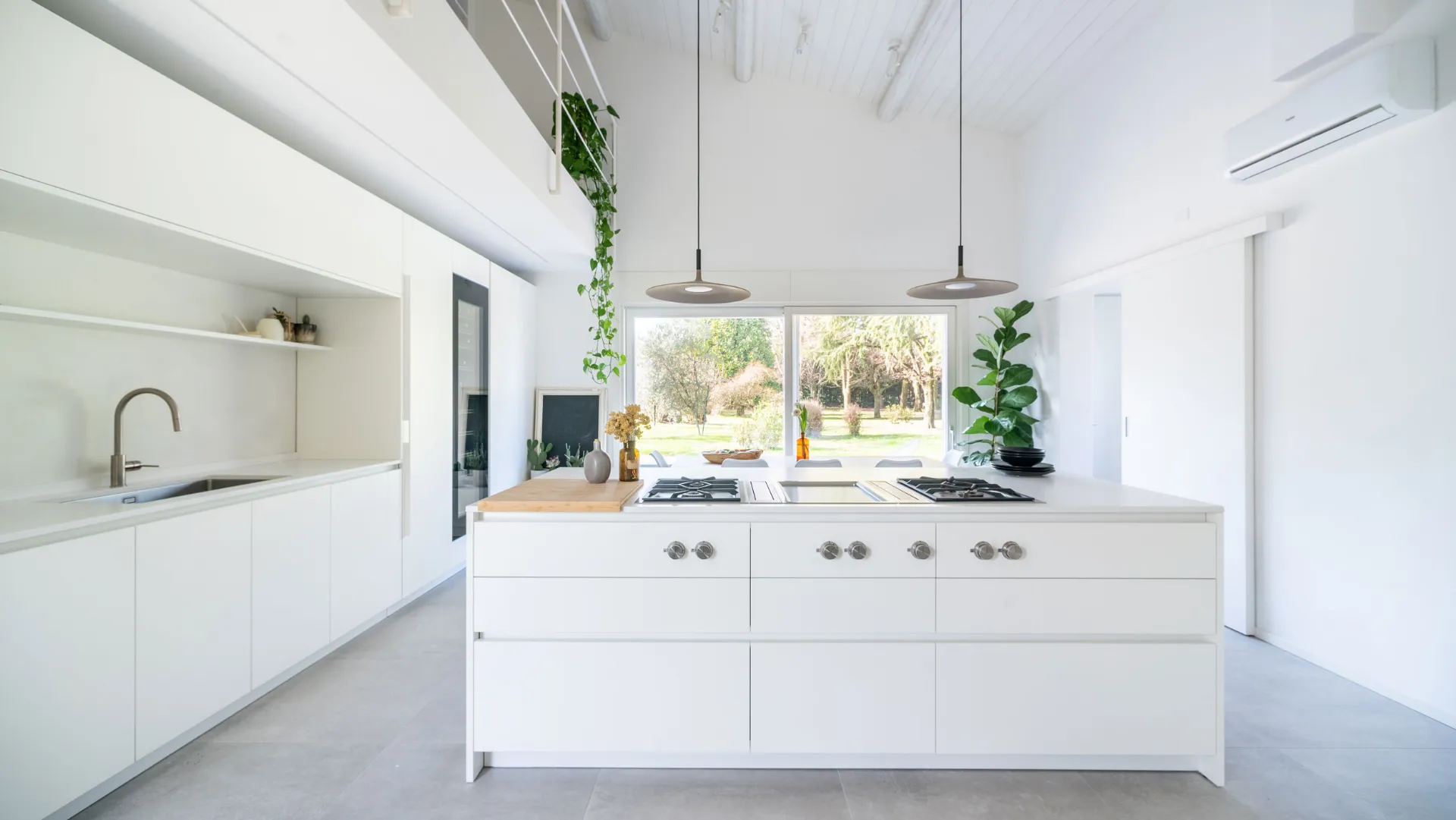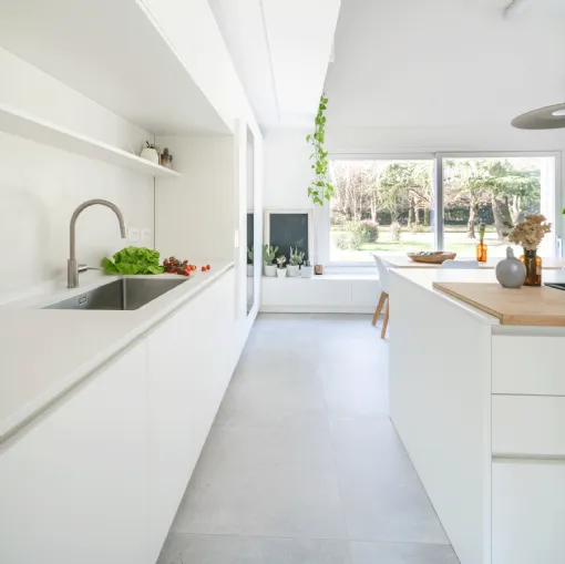 A bright environment that overlooks the green countryside of Verona. The linear architecture and bright tones give the environment an atmosphere of tranquility and peace. The contrast with the green of the trees that can be seen from the large windows marries perfectly with the modernity of the interior furnishings.