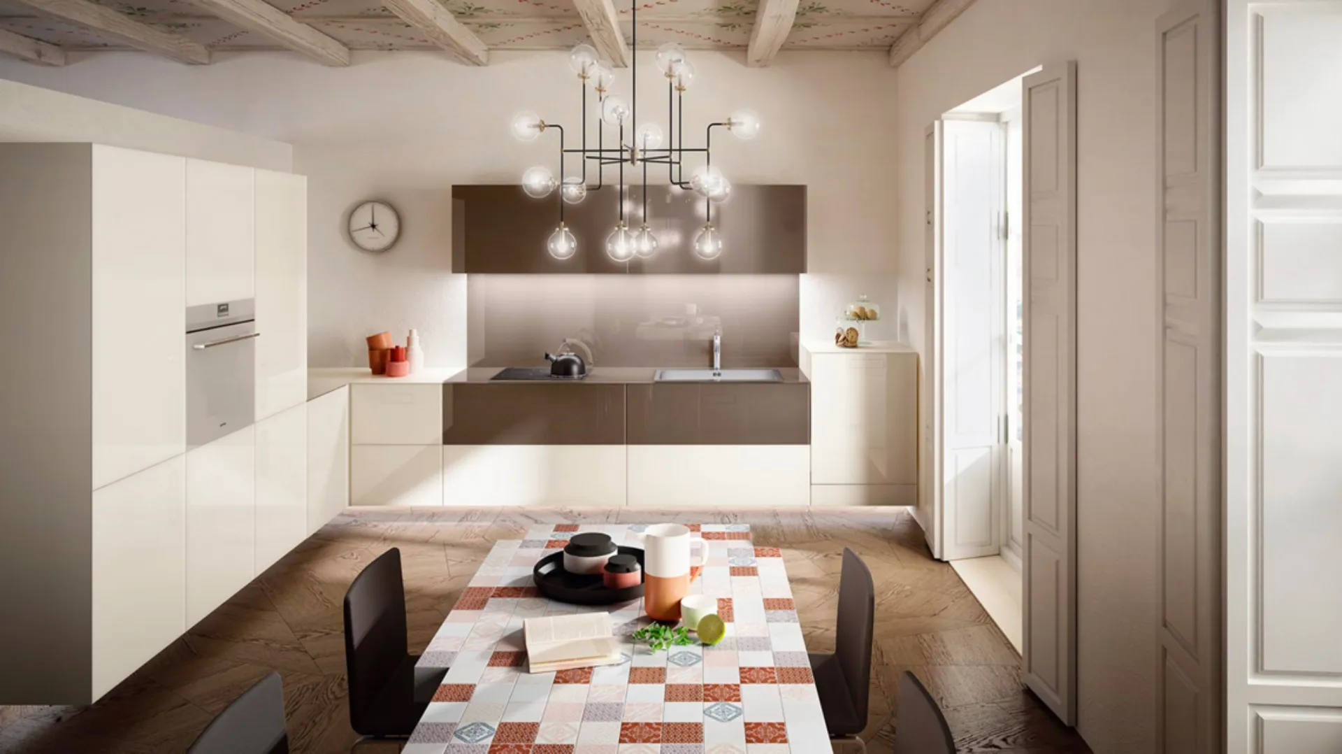 This composition è made of glass, resistant and with a modern aesthetic. Corner kitchens are increasingly ugrave; spread thanks to the perfect organization of the space they propose. The corner kitchen version optimizes the environment without diminishing the elegance of the design style, thanks to the practicalityà of this type of composition. This 36e8 Lago design kitchen model ensures a well-balanced encounter between practicality; and design.