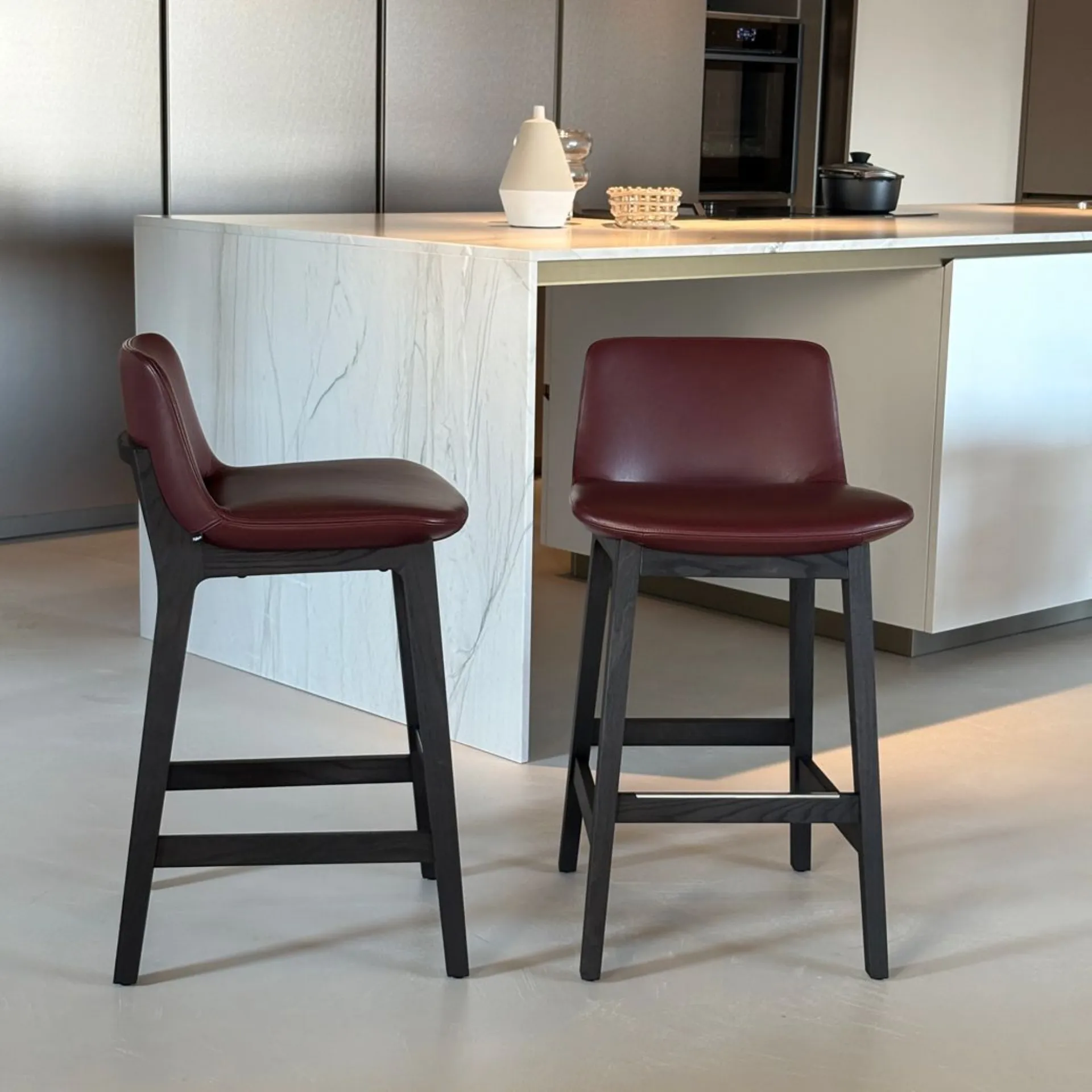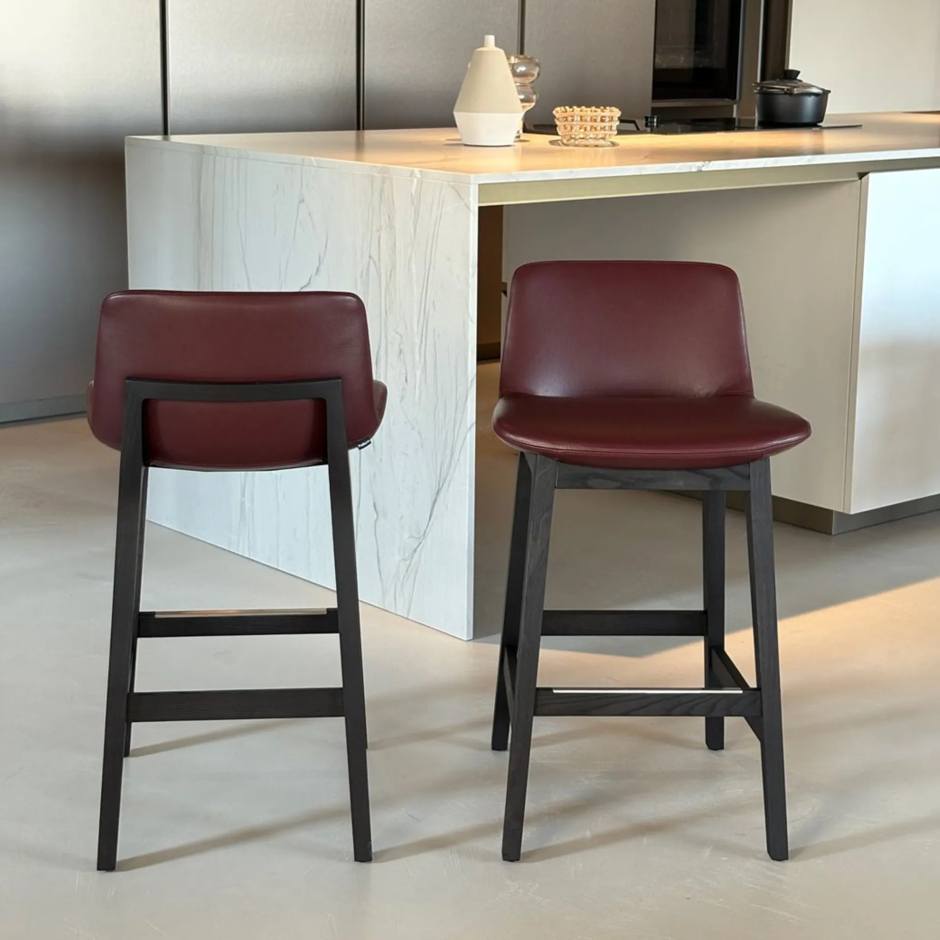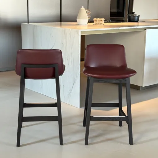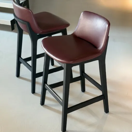 Product: No. 02 Ventura stools Brand: Poliform Ventura model stools with black elm finish structure and seat upholstered in Soft Bulgarian leather.