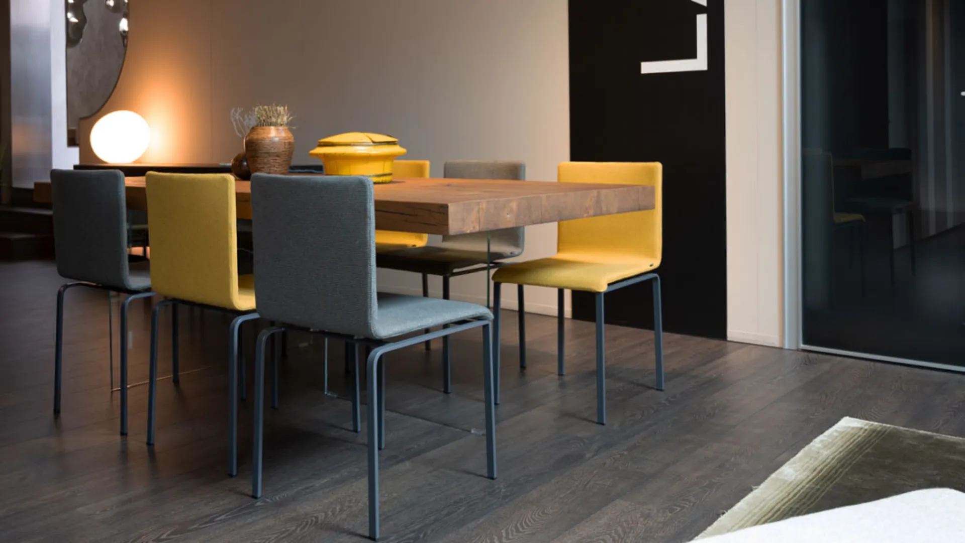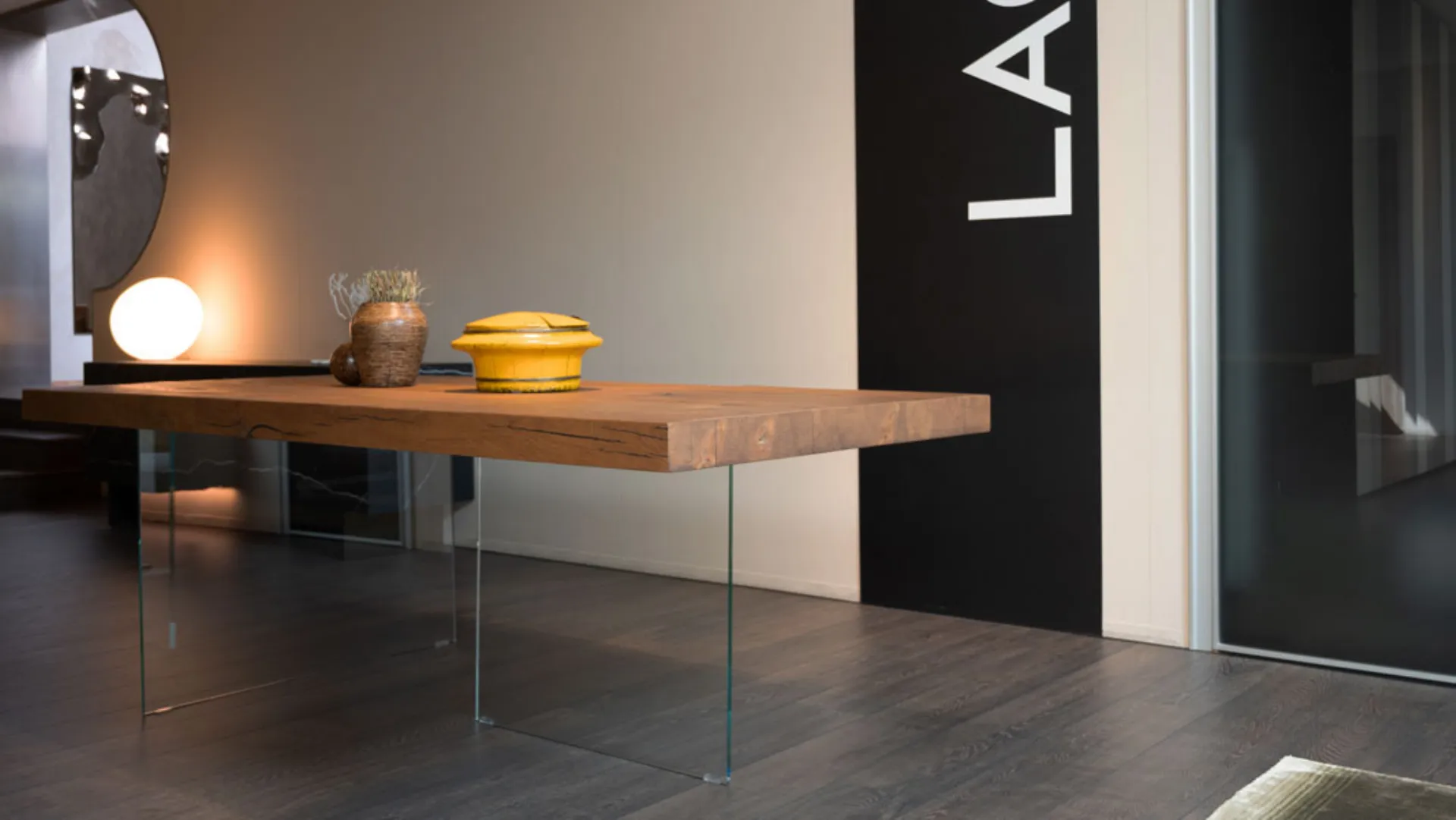 Air table by Lago with closed heads in the finish WildWood with glass leg. The table measures 220 x 100 cm. Come and find out in our showroom.